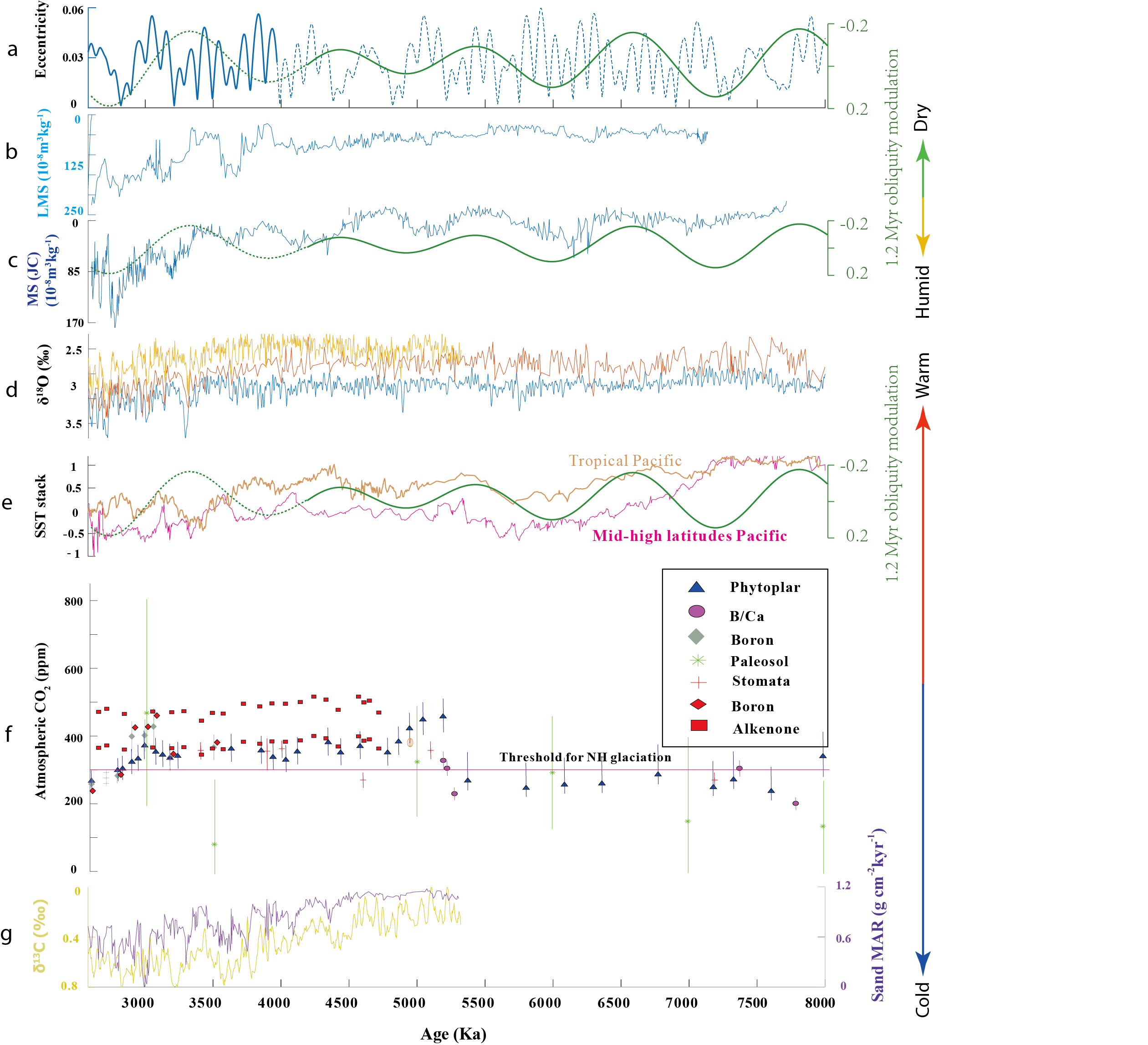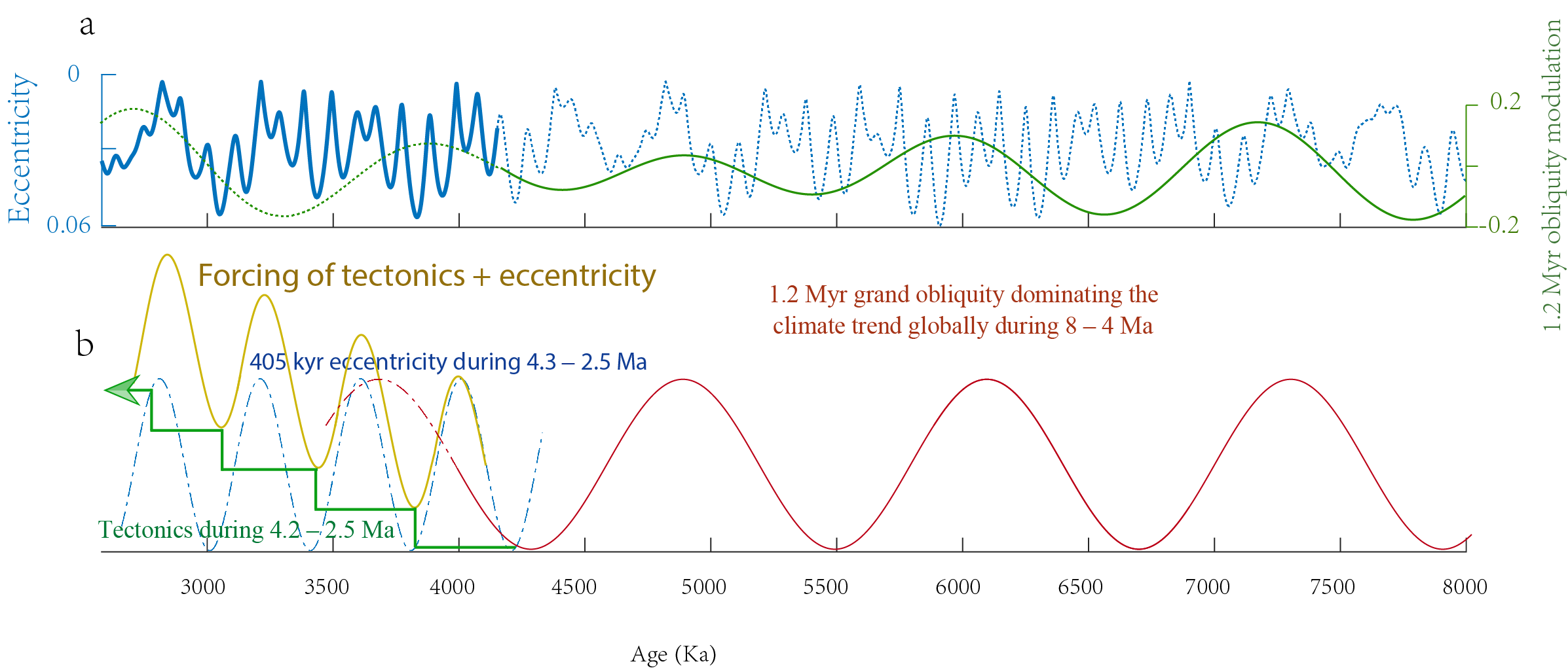 图3:晚中新世至上新世亚洲季风的简化天文气候模型。a, 偏心率周期(蓝色)和~1.2-Myr的倾角调制周期(绿色);b, 数学模型显示1.2-Myr斜率周期作用力(红色)、400-kyr长偏心率周期(蓝色虚线)、构造的阶段性影响(绿色箭头)以及长偏心率和构造叠加复合体(黄色)