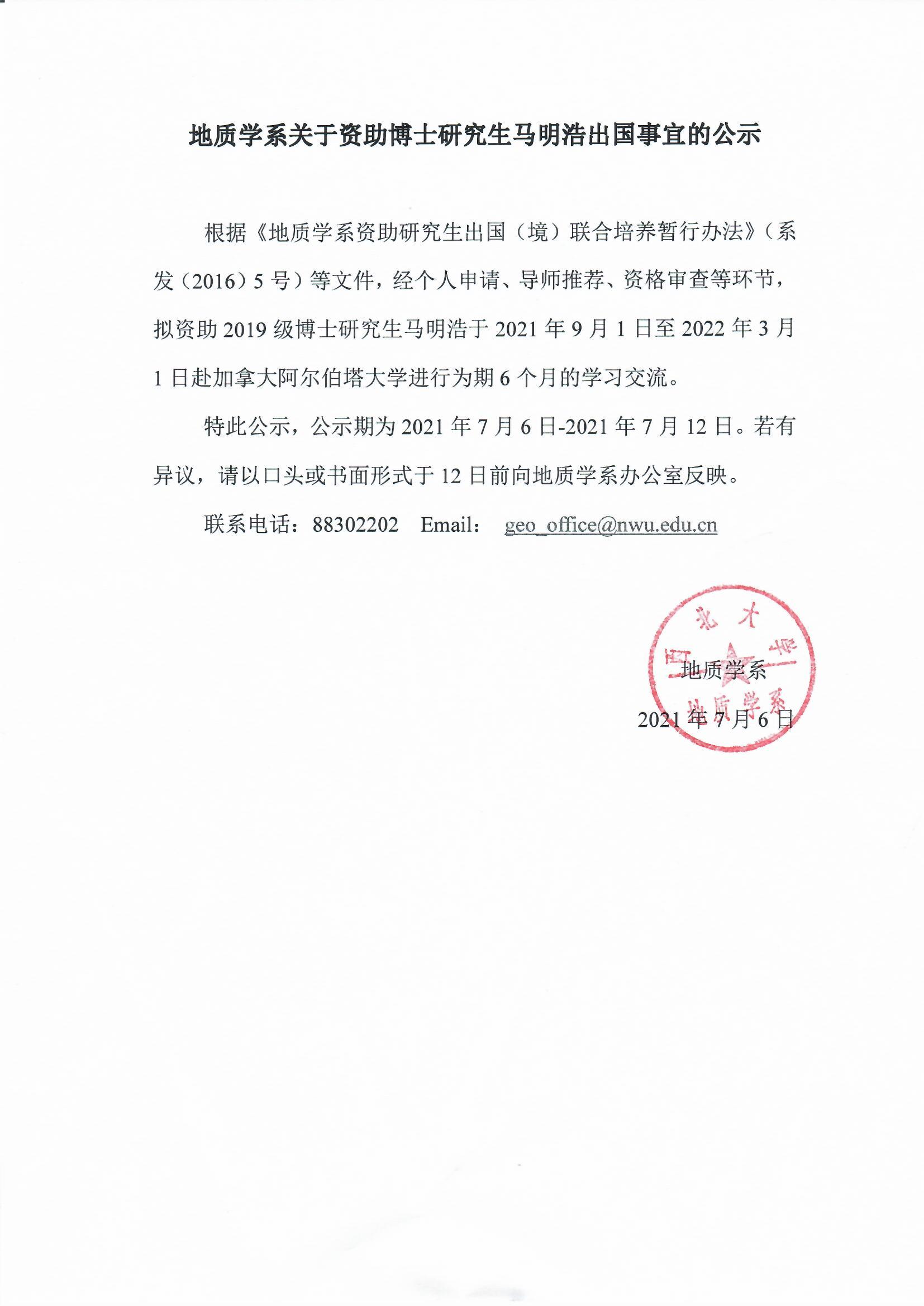 a片网站 关于资助博士研究生马明浩出国事宜的公示