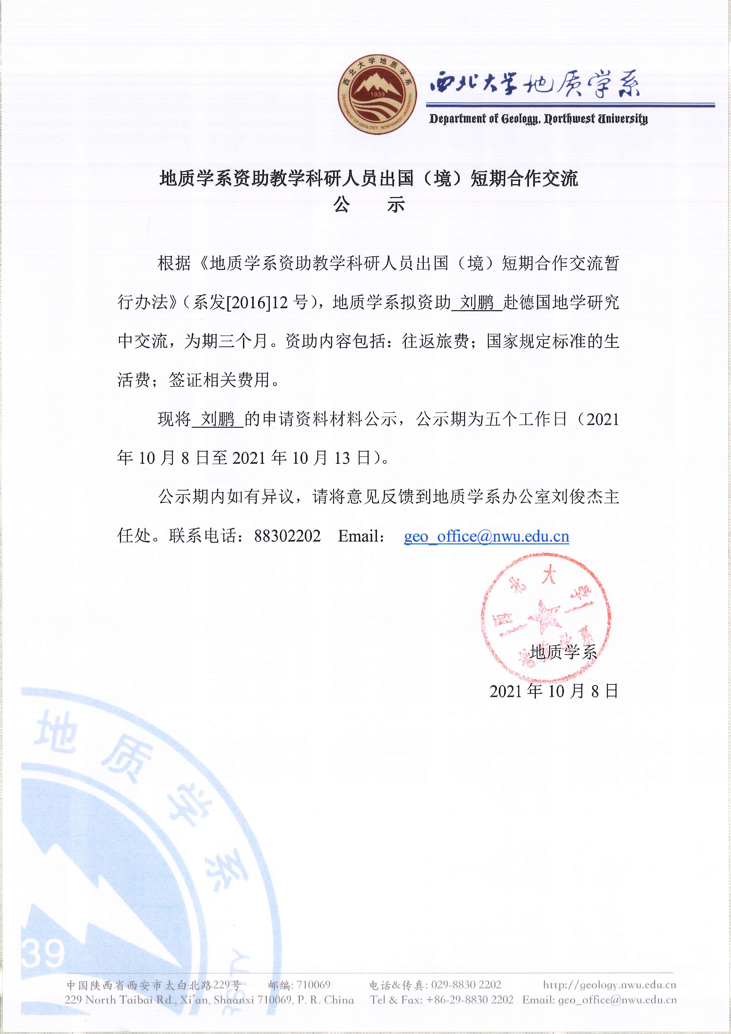 a片网站 关于资助教师刘鹏出国短期合作交流的公示