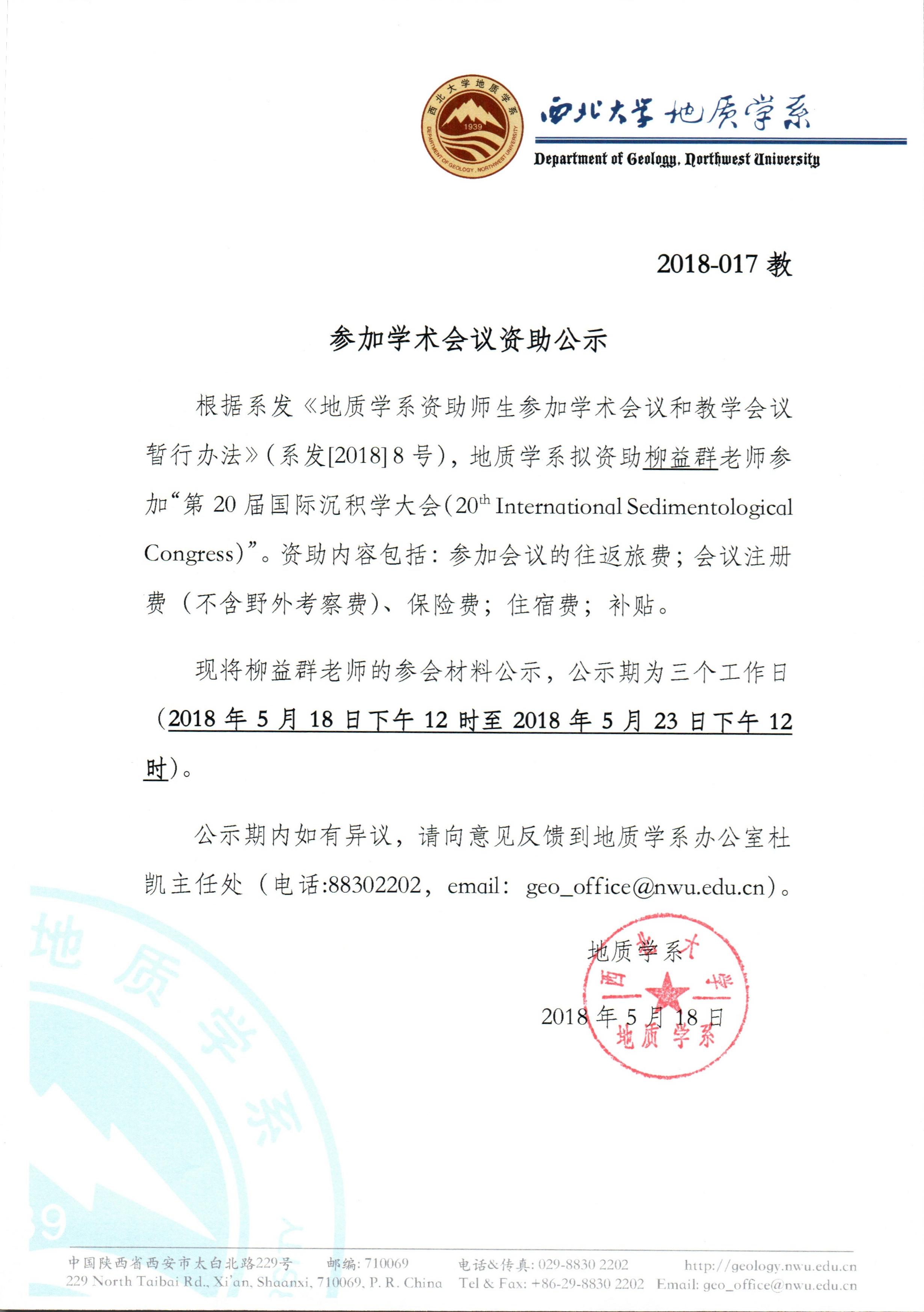 a片网站 关于资助柳益群老师参加学术会议的公示